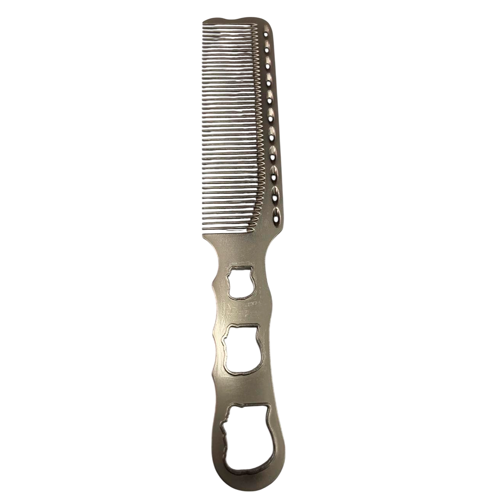 La Peineta de Corte Metálica Profesional es una herramienta única y resistente, ideal para barberos que buscan precisión, estilo y durabilidad. Su diseño ergonómico facilita el agarre durante sesiones largas de corte, y sus aberturas en el mango aportan funcionalidad y estética.